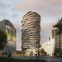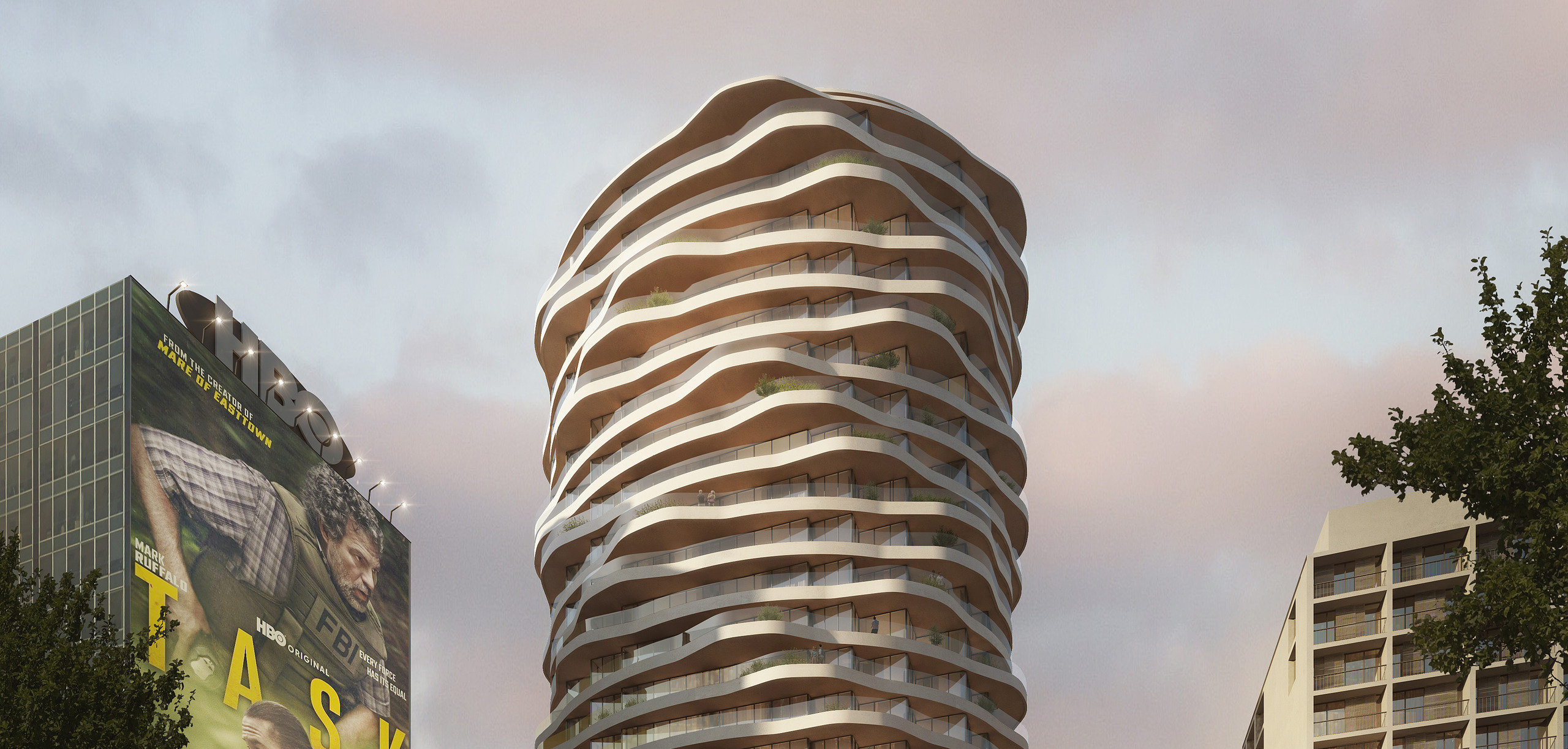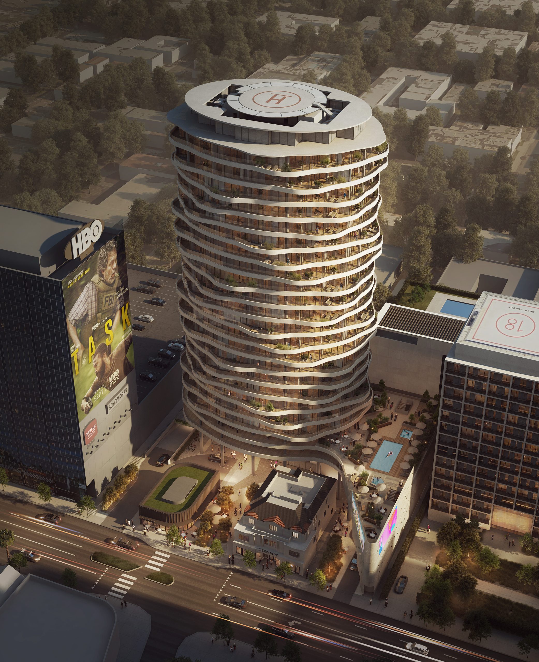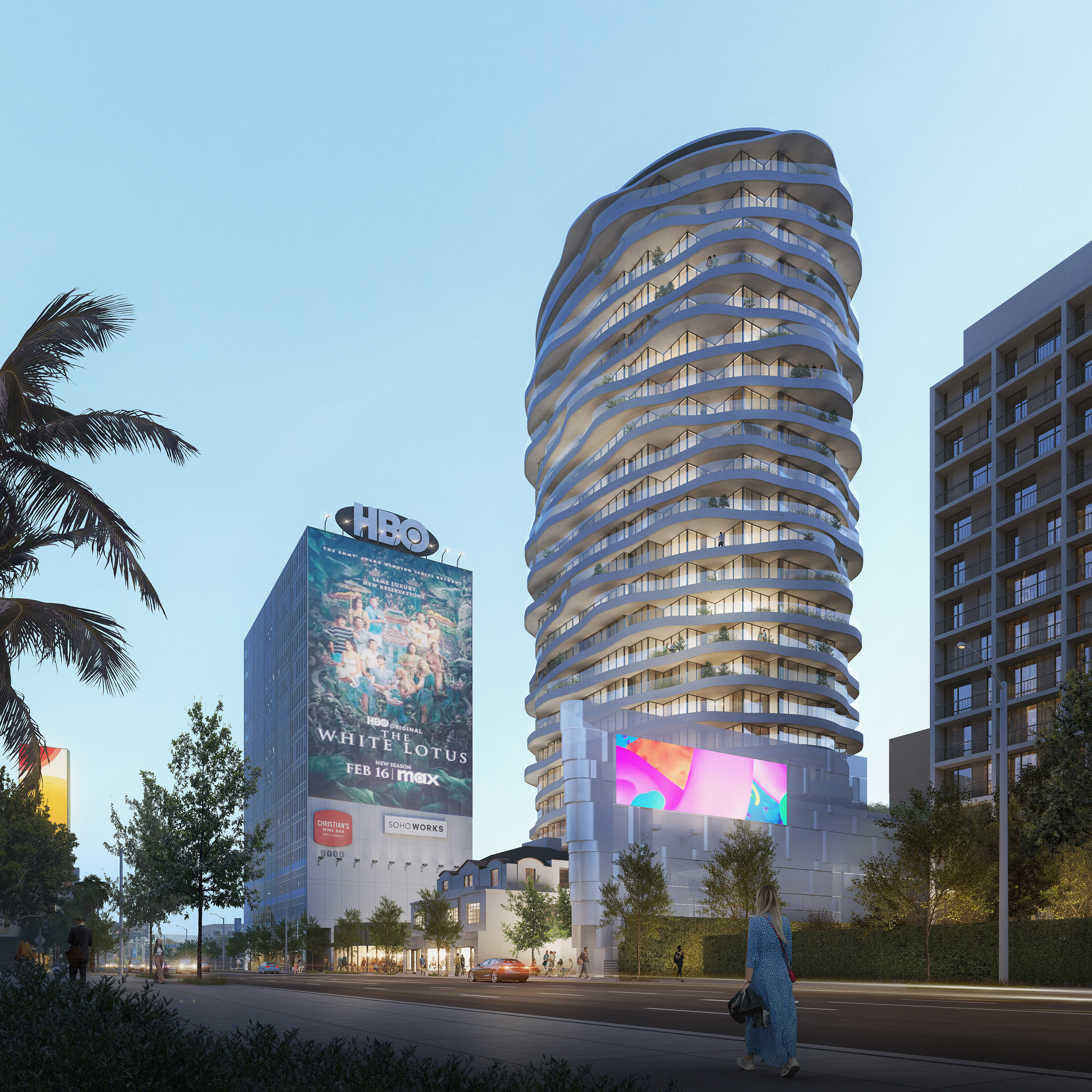 Located on a T-shaped lot along Sunset Boulevard, the 22 story tower features curved and rotating floor plates that allow each floor to extend beyond the building envelope. The individual floor plates are oriented to iconic views throughout West Hollywood and Los Angeles. These view corridors of meandering adjacent hillside streets above Sunset combine to create a shifting, sculptural building form grounded in the surrounding context. Along the envelope, outdoor balconies embrace the Southern California climate, while a series of planters and deep overhangs provide privacy and protection from solar heat gain.