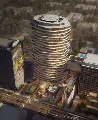Resting atop a podium complex, the spiraling Sunset Tower includes hotel rooms, multiple event spaces, and affordable apartment units. While the tower is set back from Doheny and Sunset Boulevard, the project’s retail and restaurant uses meet the street along the three-story podium structure. The roof of the podium offers outdoor amenity spaces, including a pool and lounge areas. Below, underground parking levels house over 500 parking spaces.